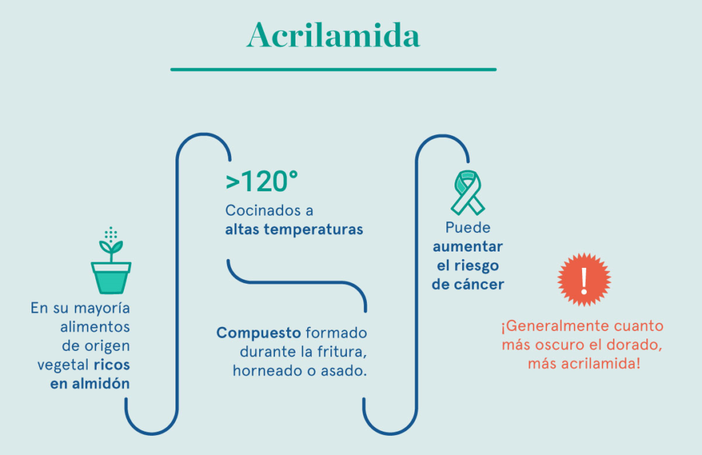 La acrilamida es un compuesto químico formado por la reacción entre los aminoácidos y las sales cuando se someten a altas temperaturas (a partir de 120°C) y en ambientes con baja humedad, como el proceso de fritura y cocción de alimentos. Es una sustancia potencialmente cancerígena y su consumo en exceso puede causar daño a la sangre, principalmente por la formación de tumores en el sistema nervioso central. Se recomienda evitar el consumo de alimentos fritos, asados o excesivamente cocinados para reducir la exposición a la acrilamida.