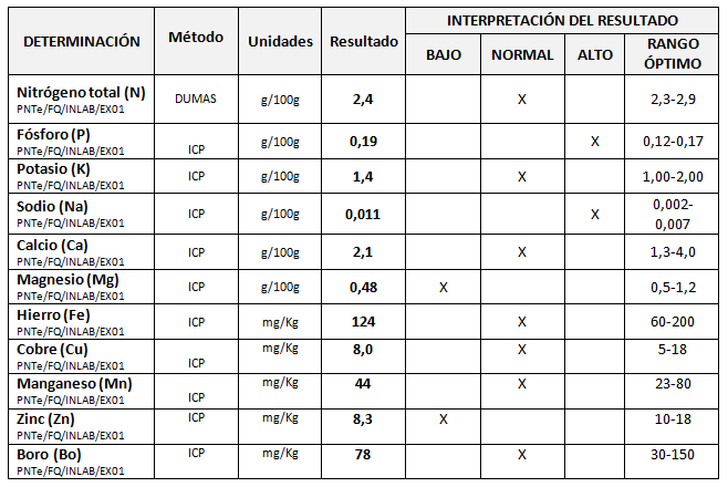 Los análisis foliares que realizamos en Innotec Laboratorios incluyen todos los macronutrientes y micronutrientes: Nitrógeno, Fósforo, Potasio, Sodio, Calcio, Magnesio, Hierro, Cobre, Manganeso, Zinc y Boro. Tal y como se muestra en el siguiente ejemplo de informe, el análisis incluye una interpretación de los valores; los cuales varían según el cultivo de que se trate.
